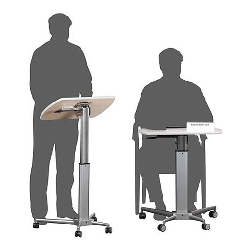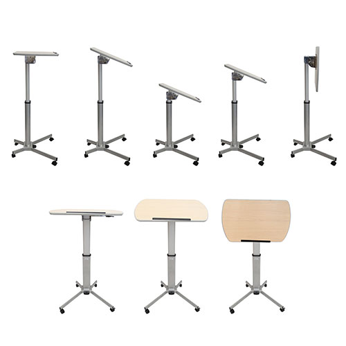 Two tables in one and height adjustable. Unique pneumatic gas lift operation with foot release pedal tested to over 10,000 cycles. Table top can be tilted to various angle to provide a Lecturn that can be easily raise or lowered. With table top flat it provides a perfect small desk for exams, note taking, registration desk or even for eating a meal in front of the TV! Perfect for schools, educational facilities, conferences meeting rooms and functions.