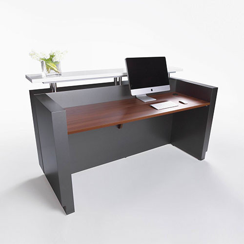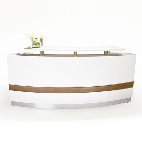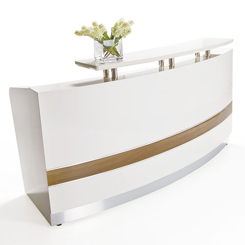 Executive style designed to impress. Counter body in gloss white with feature gloss teak panel and Aluminium strips. Curved design adds elegance and flair. Gloss teak desk top, jade white stone hob and stainless steel kick plate.