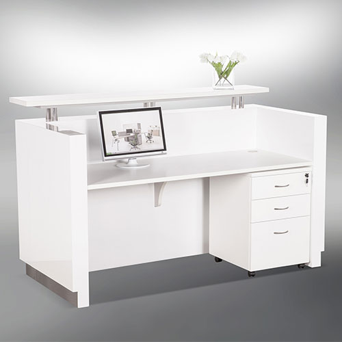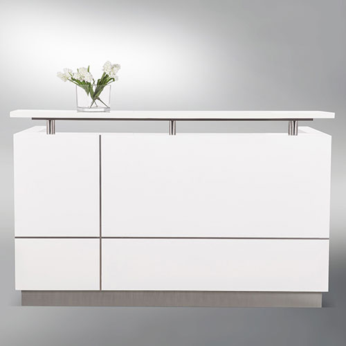 Clean modern lines with style and functionality. Quality materials and fittings. Counter body in finished in High Gloss White 2 Pack paint with feature aluminium strips. White desk top, jade white stone hob and chrome kick plate.