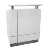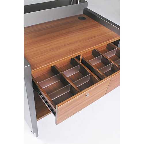 Elegant and versatile. Ideal for retailers. Teak desktop with two lockable drawers. Jade white stone hob and stainless steel kick plate for added style. Counter body available in 2 colours; metallic grey with feature aluminium strips or High gloss white with feature aluminium strips.