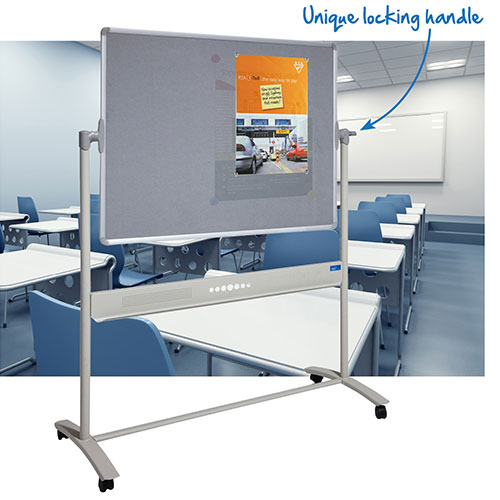 UNIQUE – Whiteboard one side, grey felt board the other. Versatile and practical – ideal solution for primary schools, early education, anywhere you need to hang posters and use a whiteboard. Saves wall space.